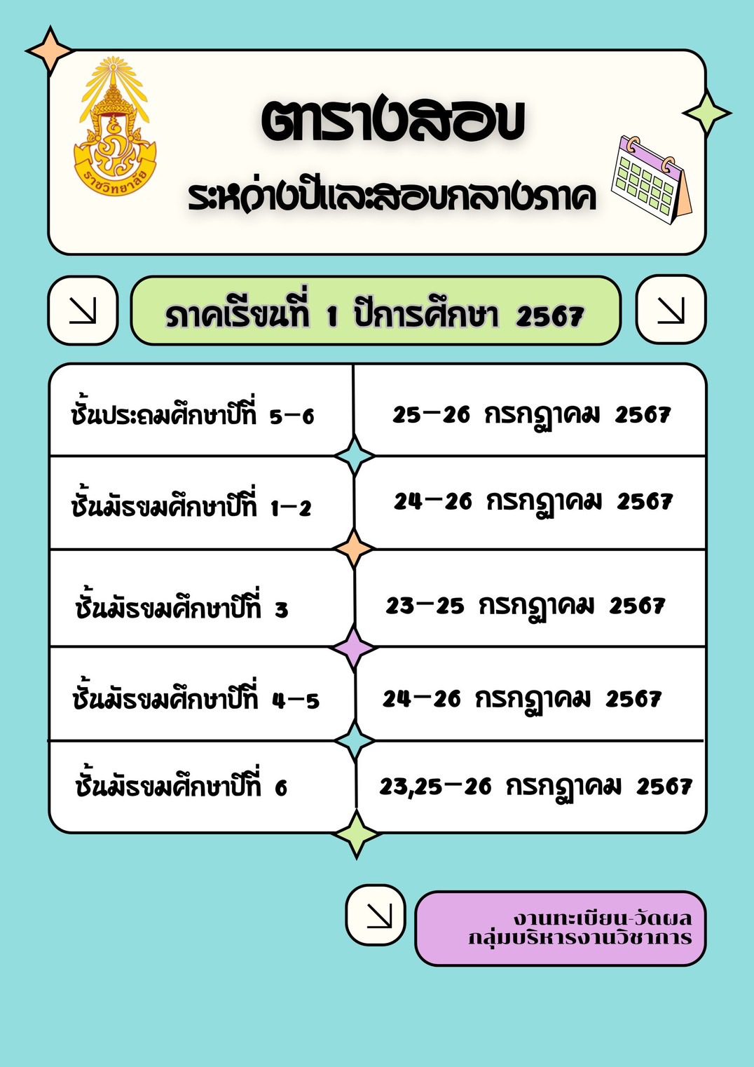 ตารางการสอบระหว่างปีและสอบกลาง ภาคเรียนที่ 1 ปีการศึกษา 2567
