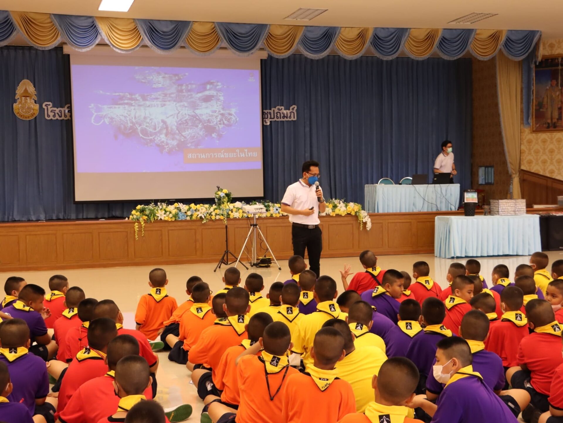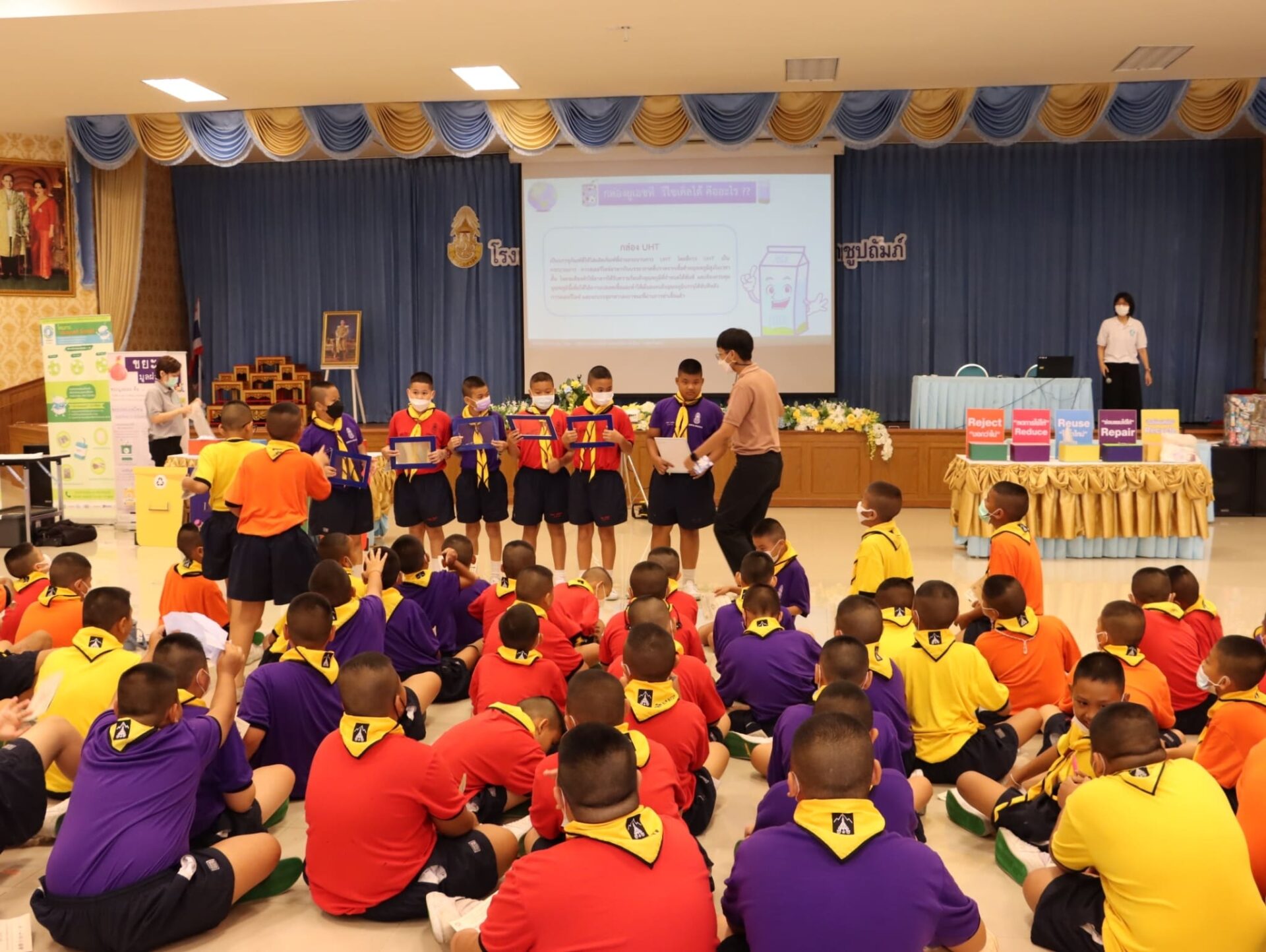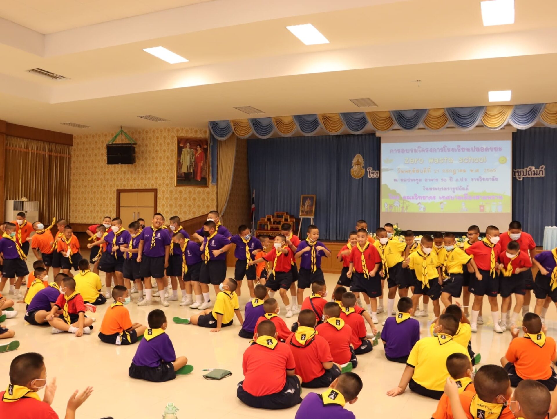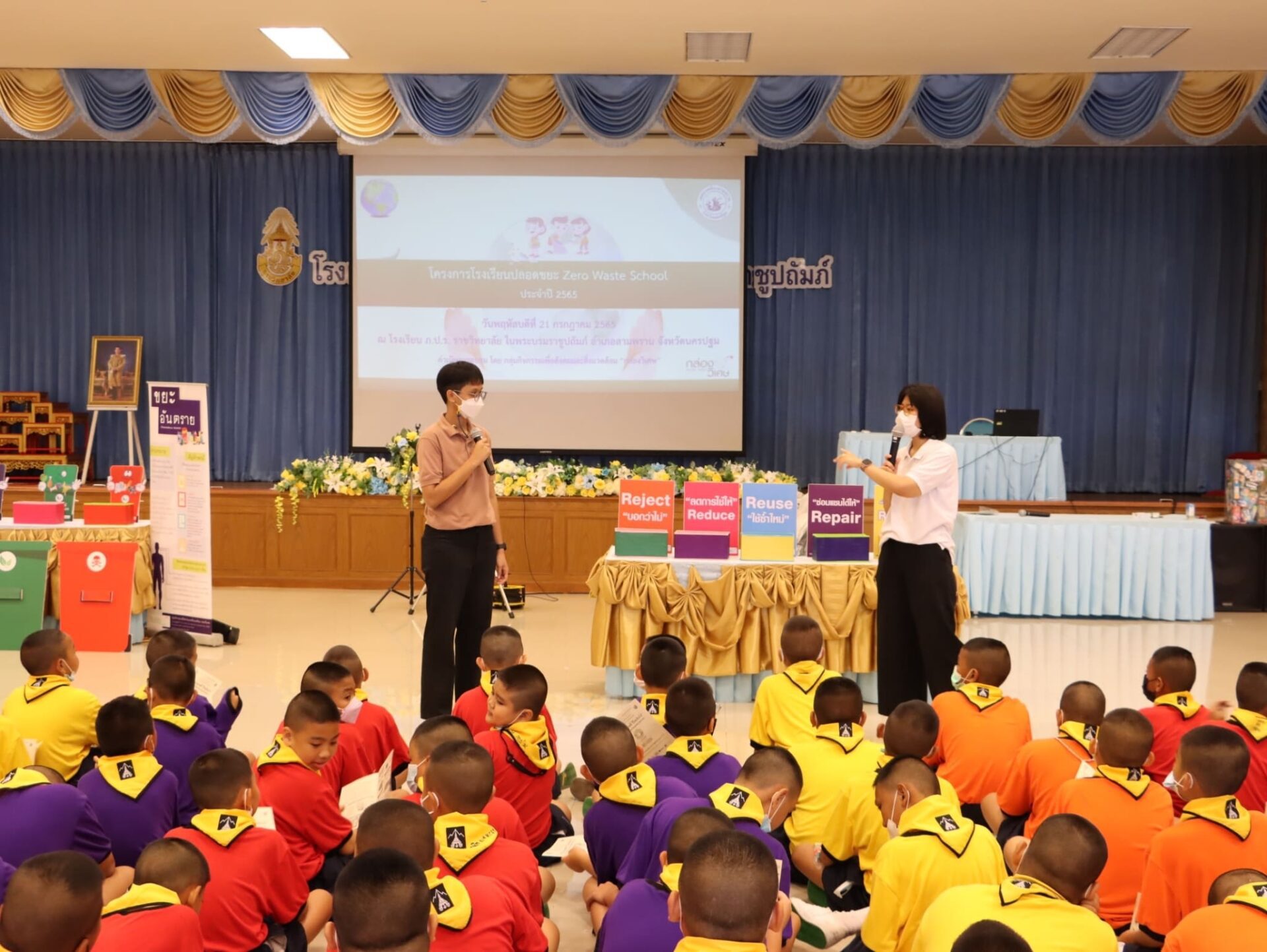 วันพฤหัสบดีที่ 21 กรกฎาคม พ.ศ. 2565 กลุ่มบริหารทั่วไป โรงเรียน ภ.ป.ร. ราชวิทยาลัย ในพระบรมราชูปถัมภ์ จัดการอบรมโครงการโรงเรียนปลอดขยะ zero waste school ประจำปีการศึกษา 2565 เพื่อเป็นการกระตุ้น และรณรงค์เสริมสร้างจิตสำนึก และความรู้ความเข้าใจถึงแนวทางในการลดปริมาณขยะ รวมถึงการแยกขยะ เพื่อการนำไปใช้ให้เกิดประโยชน์ โดยเชิญคณะวิทยากร โครงการกล่องยูเอชที ความร่วมมือจากเทศบาลเมืองสามพราน มาให้ความรู้ แก่คณะครู และนักเรียนระดับชั้นประถมศึกษาปีที่ 5